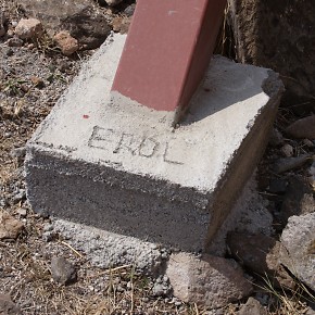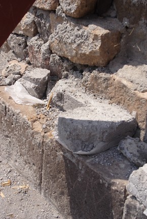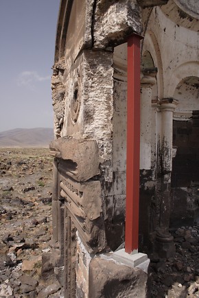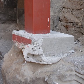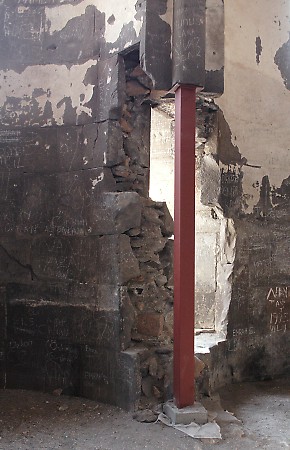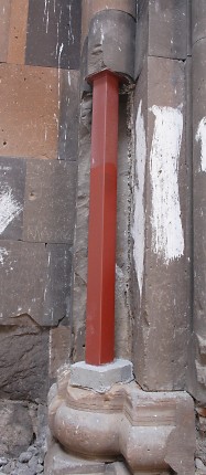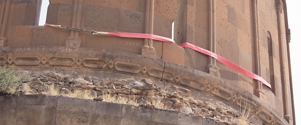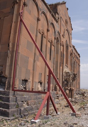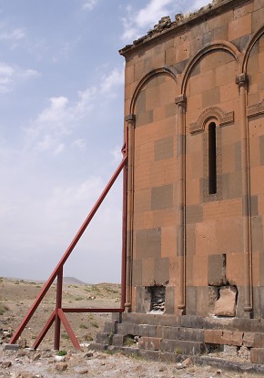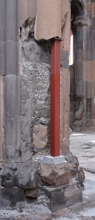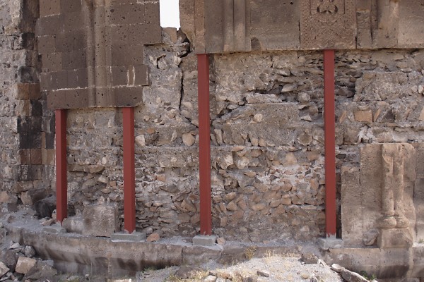 Renewed destructive activities by the In the 1990s, the Ministry of Culture and Tourism of the Republic of Turkey was responsible for a "restoration" of the defensive walls of Ani that inflicted irreparable damage to them. In 2008 the Ministry of Culture renewed its destructive activities at Ani. Buildings throughout the site suddenly sprouted steel columns painted bright red. Ostensibly these columns are to help support and preserve the monuments. In reality they do no such thing - they are a visual disfigurement and in some cases have done actual damage to the structures. The columns may be part of a deception to persuade visitors to Ani that actions are being taken to preserve the monuments. If, however, they are genuinely intended to help preserve the monuments, then their use demonstrates an astonishing lack of understanding about the structural identity of those monuments. The churches at Ani have a solid concrete core (composed of lime cement, gravel aggregate, and tufa rubble) with outer and inner facings of volcanic tufa that are embedded into the concrete core. This results in a monolithic structure that can withstand compression and tension and which is extremely resistant to collapse: a church can remain upright even if 70% or more of its lower walls have been lost (as an example see the St. Sargis church at Khtzkonk). The facing stones perform only minimal load-bearing functions - their true function is to protect the concrete core from damage. It is the concrete core that supports the building. All of the steel columns have been placed underneath facing stones - stones that do not actually support anything! To make matters worse, the steel columns stand on concrete cubes that have no foundations and rest directly on the ground. Thus, even if they were attached to the concrete core, they would be incapable of supporting any weight. Some of the columns have even failed at supporting their own weight, and have fallen over. The facing stones and the concrete core work together. If facing stones are lost, the structural integrity of the concrete core will quickly become compromised as a result of damage caused by weathering, water penetration, and invasive plant roots. If large areas of facing are lost, this will eventually weaken the concrete core enough to cause the building to collapse. At Ani there has been a massive amount of stone robbing, an activity that continued until recent decades. At the start of the 20th century Nikolai Marr recognised the risk that this loss had created. He attempted to repair the damage by replacing missing facing stones in the lower courses of many of the churches. Those repairs were destroyed after control of Ani fell to Turkey, resulting in the eventual collapse of most of the repaired buildings. Photographic Evidence The following photographs do not show all of the monuments affected by the steel columns. For example, the Georgian Church is now encased in a structure that resembles a giant spider. The Lion Gate has a flimsy inner arch made of steel - it is fixed to the underside of the original arch using bolts that have been drilled into its voussoirs, splitting a number of the stones. The original arch was in no danger of collapsing until the drilling weakened the integrity of the stones within it.