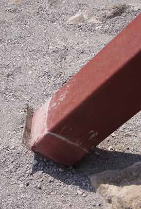 3. & 4. These photos reveal how insubstantial the foundations of the steel columns are. A column has fallen off its concrete base and now leans against the church.