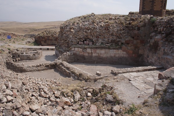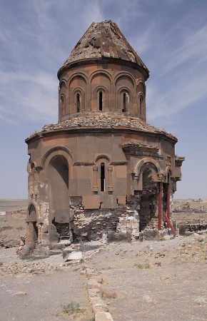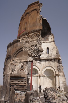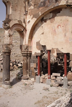 16. & 17. The Church of the Redeemer is the structure at Ani that is currently at most risk of collapse. In 1912 Nikolai Marr undertook essential repair work that he hoped would ensure its continued survival. This consisted of replacing large areas of missing facing stone. After Ani became Turkish territory, Marr's restoration work was destroyed. Half of the church collapsed in the 1950s and the surviving half was further damaged in the 1988 earthquake. The steel column standing on the doorjamb serves no real purpose - when the structure above it falls, it will fall with or without this column.