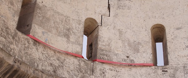 19. & 20. A belt has been placed around part of the drum of the dome. It is a single strap, twisted into a figure-of-eight shape. The belt flaps about loosely in the wind - note the marking where the steel tie has been scraping against the stone of the colonnette. The theory seems to be that the strap will help hold together the two parts of the drum which are separated by a crack. In reality, the belt will have no effect in supporting the structure, will do nothing to prevent a possible collapse of the dome, and might serve to make the resulting damage worse: tying the two sections together will ensure that if one were to collapse it would tear down the other.