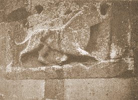 The more southerly is the largest; and the round arches which support the roof rest upon four pilasters of curious design. I photographed one of the best preserved among them, which is adorned with the figures of two birds in low relief (Fig. 82). They are represented in the act of pouncing upon animals. The pilasters are composed of blocks of black stone; while for the capitals and the upper portion of the building only pink stone has been used. The façade and the apse have fallen away. The dimensions are small: a length of 30 feet 9 inches and a breadth of 17 feet 4 inches. One of my predecessors discovered in the contiguous building a bas relief upon which was portrayed two figures on horseback, one of which is St. George with the dragon at his feet. But this piece, as well as another, in which a mounted and aureoled archer is displayed, surrounded by the forms of birds and wild animals, is no longer to be seen. I showed the reproductions in Brosset’s Atlas to the aged priest; he recognised the latter of these sculptures and informed us that it had been stolen. Quite probably both are now lost in some museum. [footnote 30]