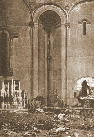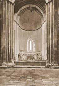 The interior is quite remarkable from the standpoint of the history of architecture; it is also calculated to deserve the admiration of the lover of art. It has many of the characteristics of the Gothic style, of which it establishes the Oriental origin. [footnote 12] The dome is supported by four massive piers of coupled pillars with plain capitals. Four similar piers are placed at either extremity of the building, a pair at the entrance and one on each side of the apse. A feature of the edifice is the extreme narrowness of the aisles and the corresponding constriction of the side chapels at their eastern extremity. The relative proportions of the apse and of these minor apses may be discovered by a glance at the illustration of the eastern front, where the extent of the latter is indicated by the two arches with little windows, one on either side of the niches. The Gothic appearance of the interior is still further accentuated by the bold pointed arches which spring from the piers. Our curiosity is aroused by these characteristics; but our emotions awake as we contemplate the magnificent apse (Fig. 74). [footnote 13] That element of grandeur which we miss in Armenian churches is here made manifest in a high degree. It is imparted by the apse to the whole interior; and the apse becomes, by a happy inspiration of the architect, indeed the head and soul of the church.