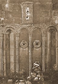 Vestiges of paintings upon the ceilings have been observed by my predecessors; but I do not know that the building suffers from their destruction. The plaster has fallen, and the perfection of the masonry is exposed. The roofs as well as the walls are composed of stone, and, as usual in Armenian churches, no wood or metal has been used. Even at the present day the Armenian masons are possessed of exceptional skill; and their natural gifts have been here directed by the conceptions of genius. Although the interior is almost free of ornament, the art of the sculptor has been employed upon the enrichment of the outside niches, of the doorways and windows, and of the mouldings of the false arcade. In no case do we discover any trace of barbarism; the designs are sober and full of grace, the execution is beyond praise. [footnote 14] The impression which we take away from our survey of these various features is that we have been introduced to a monument of the highest artistic merit, denoting a standard of culture which was far in advance of the contemporary standards in the West.