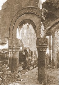 Henry Finnis Blosse Lynch was born in London in 1862, of Irish parentage. His family ran Lynch Brothers, a firm that traded with and ran shipping lines in Persia and Mesopotamia. Lynch had already travelled widely in those regions before their geographical closeness to Armenia, together with the growing importance of the "Armenian Question", attracted him to Armenia. Lynch later became a member of the British Parliament. He died suddenly in November 1913 of pneumonia. Lynch's two volume work "Armenia: Travels and Studies" was published in London in 1901, and remains the definitive account in English of Armenia before the 1915 massacres. An Armenian translation of the book was published in London in 1902, and another in Constantinople in 1913. In modern Turkey, the book was on the official list of banned books until at least the late 1990s. "Armenia: Travels and Studies" was the result of two extensive visits he made to the Turkish and the Russian controlled areas of Armenia - the first visit lasting from August 1893 to March 1894, and the second from May to September 1898. Lynch visited Ani in October 1893 and his account of that visit, with the accompanying photographs, is reproduced below. His footnotes are on a separate page. The border graphic on this page is based on the decorative band on the binding of Lynch's book, was inspired by the vine-scroll relief on the church of the Holy Cross on Acht'amar island.