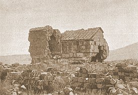 Unfortunately nothing remains of the actual walls of the palace; and the buildings which I have mentioned are two small churches. One stands upon the north side of the fortified eminence, and the other upon the south. The former is not noteworthy, except for the fact that its northern wall rises from lower levels and composes part of the wall of the citadel. But the edifice on the south is of considerable interest. It consists of two vaulted chambers placed side by side, and having the inner wall in common (No. 28, Fig. 81, taken from the north).