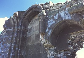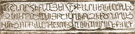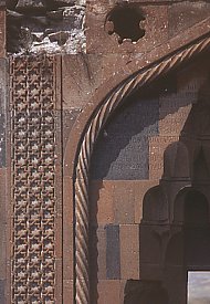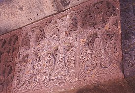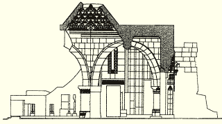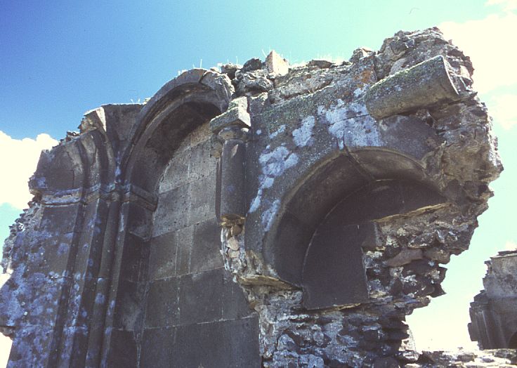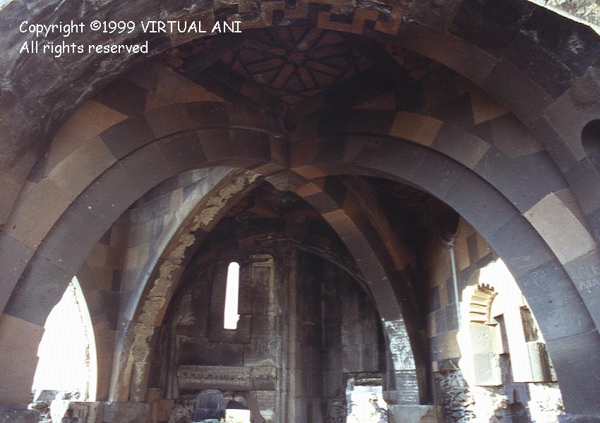 Güney narteksin duvarlarında birçok Ermenice yazıt vardır. Çoğu, 13üncü yüzyıla aittir (en eskisi 1215 tarihlidir), kimisi de 14üncü yüzyıldandır (en yenisi 1348 tarihli olmak üzere). Çoğu dini konularda değildir. Bunların arasında örneğin mali yönetim kararnameleri, vergilendirme ve ticari hacizlerden muaf tutulma veyahut bunlarda indirim hakkında ayrıntı belgelendiren vardır. Önemleri, Ani'nin o dönemki ekonomik hayatına ışık tutmaları ve narteksin dini olduğu kadar başka amaçlarla da kullanıldığını göstermelerindendir. Yapının İncelemesiGüney narteksin zengince oyulmuş doğu cephesi, Selçuklu ve Fars sanatından kuvvetlice etkilenmiştir. Giriş, bir piştak şeklindedir. Bu, eyvan şeklindeki bir nişin içine yerleştirilmiş ve süslü çerçeveli bir giriştir. Nişin çatısı, mukarnastır. Çerçevesi, sivri tepeli kemerdir. Bu kemerin üstünde, bir Müslüman yapı olması durumunda oyma veyahut seramik disk olacak yerde mazgal pencereler vardır. Cephenin geri kalan kısmı, süslü oymalı düşey bantlarla değişken olarak yerleştirilmiş sığ V-şekilli nişten ibarettir.Dış yüzeyinin düzlüğü, sadeliği ile içinin hareketliliği arasındaki zıtlık daha çarpıcı olamazdı. Tavan, kesişme noktasında bir stalaktit olan, birbirini kesen kemerlerle desteklenmiştir. Bu kemerler, incelikle oyulmuş mukarnası olan eşkenar dikdörtgen orta bölümü çerçeveler. Bu kubbeli tonozun tepesinde önceleri bir gözpencerenin olduğu söylenir, her ne kadar bugün bu iddiayı destekleyecek delil bulunmuş olmasa dahi. Diğer bölümlerin ise, kırmızı, ten rengi, ve siyah taştan oluşturulmuş kakma işiyle zengince süslenmiş düz tavanları vardır. Yapının içinin tamamı, taş işçiliğinin hüner gösterisidir. Narteksin kemerlerinin duvara dik olmalarından ziyade köşegen boyunca çaprazlamaları, belki de Ermeni mimari yapılarında eşine rastlanmaz bir olaydır. İki kare sahının aldatıcı derecede basit zemin planı, içerisinin alt bölmelerindeki çıkıntı yapan pilastrolarla vurgulanır. Ancak kubbeli orta bölmenin bu sahınların üstüne yerleştirilmesi, Barok mimarisi dışında nadiren görülen, boşlukların birbirine devam ettiği izlenimini veren çarpıcı bir etki yaratır. Küçük KiliseNarteksin güneyinde, o konumdaki yapılardan daha da eski bir küçük kilise varmış. Avlunun seviyesinin üstündeymiş, hatta ve hatta, bitişik sokağın seviyesinin de. Yarım daire apsisi olan tek nefi varmış. Apsisin güneyinde ek hücre varmış, ama kuzeyinde yokmuş. Marr, bu kilisenin kuzey duvarının güney nartekse yer vermek için ortadan kaldırıldığını düşünmüştür.Bu küçük kilisenin bir metre güneyinde ve aynı zemin seviyesinde, fırınların daha sonraki bir tarihte eklendiği, mozole vazifesini gören bir yapı daha varmış. Kazıcılar burada, ilkin mozole ya da küçük kiliseye ait olmuş olabilecek yarım kabartmalı bir taş dilim bulmuştur. Üzerinde, meyvalı ve yapraklı nar ağaçları varmış. Tarz olarak, 7nci yüzyıl kadar erken bir devre tarihlendirilebilir. |