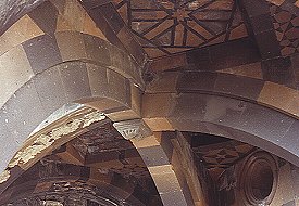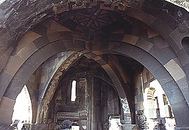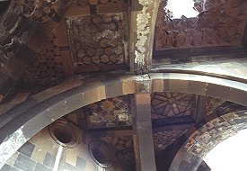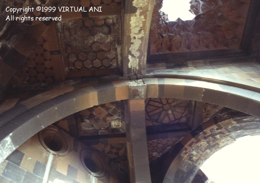 Merkezi kubbenin ağırlığını hafifletmek için boş toprak kaplar kullanılmıştır. Kubbenin konik çatısının dilimlerinde nar ve üzüm salkımı oyması varmış. Dört köşedeki şapeller, küçücük kiliselere benzermiş - her birinin apsisi ve incelikli iç yapısı varmış. Hatta ve hatta, iki doğu şapelin kendi yan hücreleri dahi varmış. En ilginç tarafı, dört yan şapelin her birinin alınlı kubbe ile örtülmüş olmasıdır; bu da bu kilisenin tasarımını türünün yegane örneği kılar. |