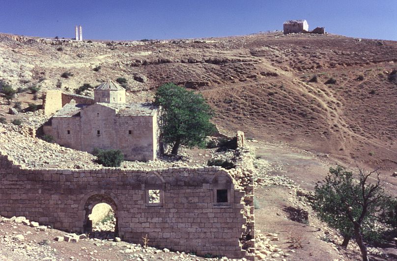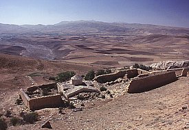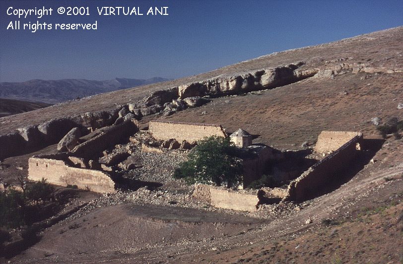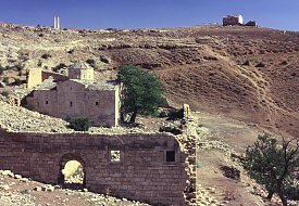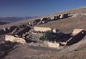 Against the west wall is a terrace planted with mulberry trees. A little below the northern end of this terrace, and outside the enclosure wall, are the remains of a structure with a large pointed vault that is open to the west - it was probably a fountain.