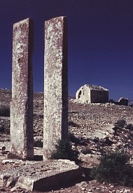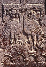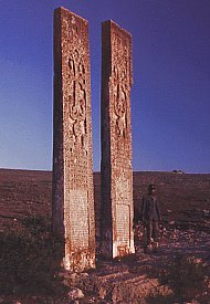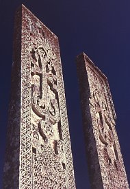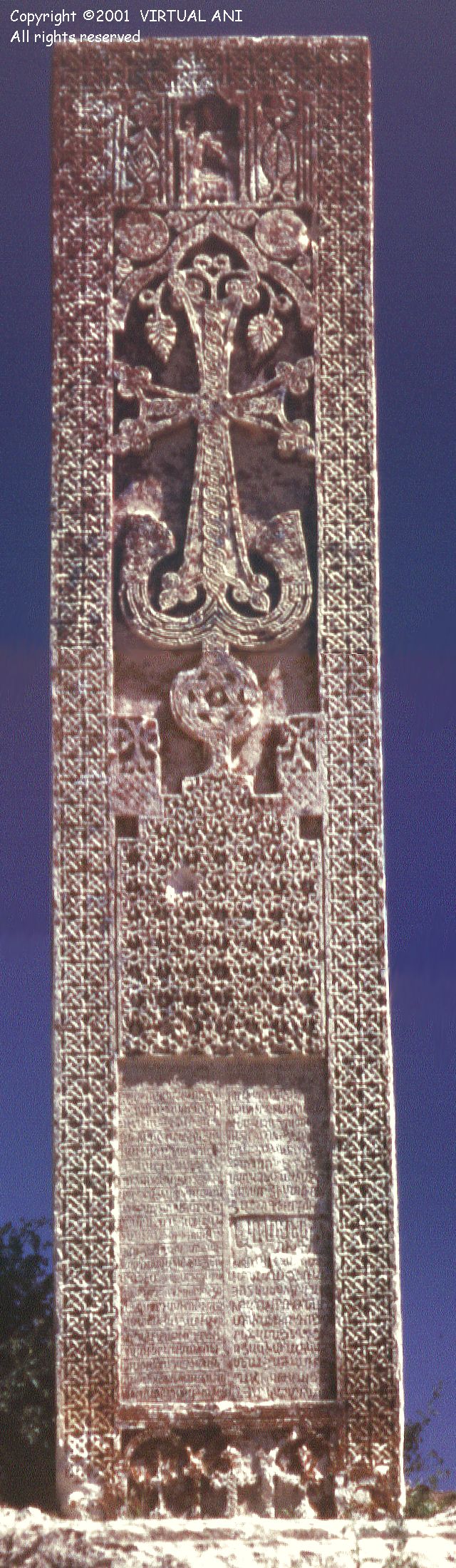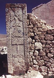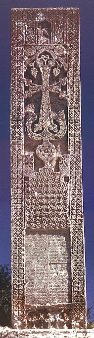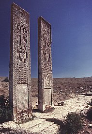 The Aprank Khatchk'arsAt a short distance from the chapel of St. David stand two very remarkable khatchk'ar monuments. They are extremely large (over six metres tall) and are dated 1191 and 1194. Their height and prominent position means that they are clearly visible from the Erzincan - Erzurum highway, 8 km away. At least until the 1970s a third, smaller, khatchk'ar stood beside them - this now lies toppled. A niche cut into the rock surface indicates that there was originally a fourth khatchk'ar. Design Analysis of the