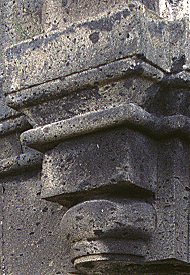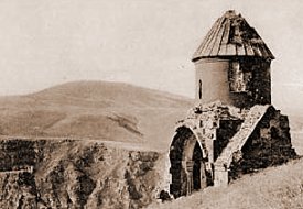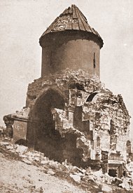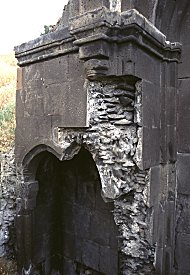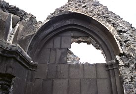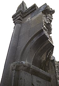 The drum and the dome were still standing in the early 1960s, but are said to have collapsed during the earthquake of 1966. I have been unable to locate a plan of this church. DescriptionThe church had a short "domed rectangle" type of design that was very similar to the church of St. John in the monastery of Horomos. The dome was placed above a plain, cylindrical drum that was pierced with four narrow windows.The church was built of a dark grey stone, and had no frescoes on its interior surfaces. The otherwise plain interior was articulated and enlivened using architectural features including engaged columns with cushion capitals, protruding cornices, and ribbed vaulting. The arches of all the vaults were slightly pointed. The apse would have been at the eastern end of the church and, in addition to the entrance in the south façade, there was probably also an entrance at the western end. The western arm of the church was slightly longer than the eastern one, and formed a short nave. There were bays to the north and the south of the nave that opened onto the nave. Corner chambers flanked the apse. What was particularly notable about the church was its monumental south doorway. This was executed according to Classical models: a monolithic lintel and jambs bearing palmettes and "egg-and-dart" mouldings, and an architrave with acanthus leaves and dentils. As such, it was similar to the doorways of the Church of the Redeemer and the Church of the Holy Apostles, and was typical of the "School of Ani" architectural style. Other sculptural decoration on the exterior included basket-work mouldings on the bevelled edges of the roof cornices and, flanking the south doorway, v-shaped niches topped with conch-like mouldings.