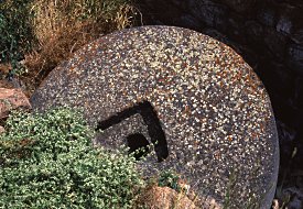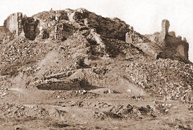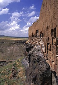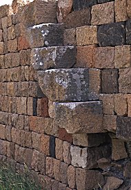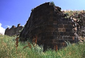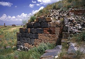 The entrance to the citadel, at [a] on the plan, was constructed at the time of the Sheddadid rulers of Ani (1072-1199) according to Nikolai Marr, and was joined to older walls. This gateway has a ramp up to it, paved with large slabs of stone. Underneath the gateway, but above the original ground level, Marr discovered the clay pipes of a conduit that had delivered water into the citadel. This water had come from a spring situated nearly eleven kilometres from the city. The citadel has no natural water supply. The rectangular tower [b] that flanks the gateway on the left is built from reused masonry: large stone blocks of black basalt. There are hollows cut into the ends of these blocks, revealing that they originally were part of a structure built using the masonry technique where large blocks of stone are held together by iron "dove-tail" cramps set in lead. In Armenia, this method of construction is found in buildings from the Arsacid period (the first to the fourth century AD). These stone blocks may have been taken from parts of the Zoroastrian "fire temple", or from another building of the same or an earlier period. Very little of this stone is reused in other parts of the citadel, suggesting that the stone was brought to the citadel from another location, and the fire temple is the most obvious site. To the left of the rectangular tower is a stretch of the citadel wall [c] whose masonry facing seems to be surprisingly fresh in appearance (see photograph 6). This is probably an unrecorded reconstruction from the time of Marr's excavations. In 1907, on the slopes of the citadel, fragments of a Greek inscription were found. It had probably fallen from the citadel, and must have dated from the brief period of Byzantine rule at Ani. Basmadjian mentions finding, in 1903, a fragment of a Greek inscription in the citadel - perhaps the same inscription. Within the citadel ramparts are the extensive ruins of a palace [d] that occupied the highest part of the citadel hill, the ruins of at least five churches [e, f, g, h, i], and the ruins of several unidentified buildings. Today, there are the visible remains of three churches within the citadel: the "Church of the Palace" [e] , the "Mausoleum of the Child Princes" [f], and the "Hexagonal Church of the Citadel" [i].