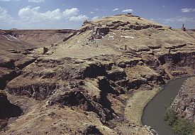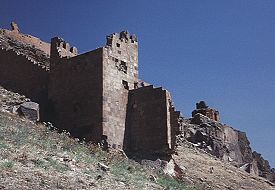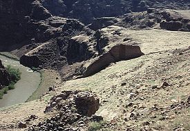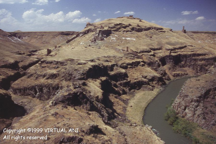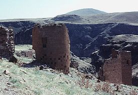 Walls descend from each side of the citadel hill towards the edge of each ravine. The wall that descends from the western side of the citadel is said to date from the 13th century and is, at first glance, curious because it appears to be facing the wrong way. This is because it was designed to protect the flat area to the south of the citadel, which comprised a separate fortified enclosure.There are no traces of buildings in this enclosure, only the remains of the graveyard mentioned below. Perhaps it was deliberately left as an open space for livestock.The wall that decends from the eastern side of the citadel would have stopped successful assailants of the enclosure from working their way around the citadel to attack Ani from its eastern side. Attackers taking this route would have, in effect, to break through three sets of walls before entering the city.