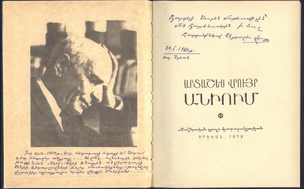 Artashes Vruyr was the son of Aram Vruyr, the main photographer for Nikolai Marr's archaeological expeditions at Ani. In 1964 Artashes Vruyr published his memoirs of those days at Ani. His book was reprinted in 1979. The copy below is signed by Vruyr, and he has also written a note about how he is now the very last survivor of those who were at Ani.
