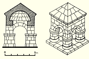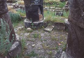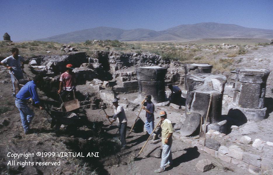 Kalıntıların, M.S. birinci yüzyılın başı ile dördüncü yüzyılın ortalarına ait Zerdüşt "ateşgedesi" olduğu düşünülmektedir. Öte yandan, Hristiyanlığın ilk dönemine ait bir eser, yani dördüncü veyahut beşinci yüzyıla ait bir açık-hava şehitliği (İng. "martyrion") olması da olasıdır. Ermenistan’da pek çok yeraltı şehitliği vardır, ancak açık-hava şehitliğinin başka bilinen örneği yoktur. Amacı her ne olursa olsun, büyük olasılıkla Ani'de süregelen en eski yapıdır ve, eğer bir ateşgede ise, Ani'de Hristiyanlık öncesine ait en az bir önemli yapının var olduğunu kanıtlar. Yapı, daha sonraki bir dönemde, sütunların arasına kavisli duvarların örülmesiyle, bir şapel işlevini görmüştür. 1998 ve 1999 yıllarında, ateşgede, Ani kazıları şefi Prof. Beyhan Karamağaralı tarafından yeniden kazılır. Ne yazık ki, "arkeolojik çalışma" lafı çok gevşekçe kullanılır. Çoğu zaman, etrafta arkeolog yoktur - sadece işçiler ve de başlarında bir çavuş (böylece gerçek modern arkeolojinin koruyup incelemeyi gaye edineceği veriler mahvedilmektedir), ki bu da Karamağaralı’nın raporundaki belirsizlikleri açıklamaktadır ¹. İşin çoğu, Marr'ın kazılarından sonra biriken döküntüyü temizlemekten ve dağılmış sütunları yerleştirmekten ibaretti. I. Justin'in hükümdarlığı döneminden (M.S. 518-527) kalma bir Bizans sikkesi işçiler tarafından bulunmuştur. Bu, Ani'de bu imparatorun dönemine ait bilinen tek örnek olabilir ². | ![]() |