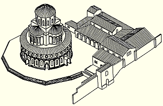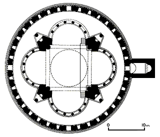 nokta, ikinci katın dairesel mi yoksa dıştan dört yapraklı mı olduğudur. Mimar Toros T'oramanian'ın 1900'lerde çizdiği Zvart'nots modelinde, sözü edilen ikinci kat daireseldir. Bu, görsel bakımdan en çekici seçenektir ancak yapı bakımından en emniyetlisi değildir. Yukarıdaki Zvart'nots modelinde yuvarlak gösterilmiştir. | ![]() |