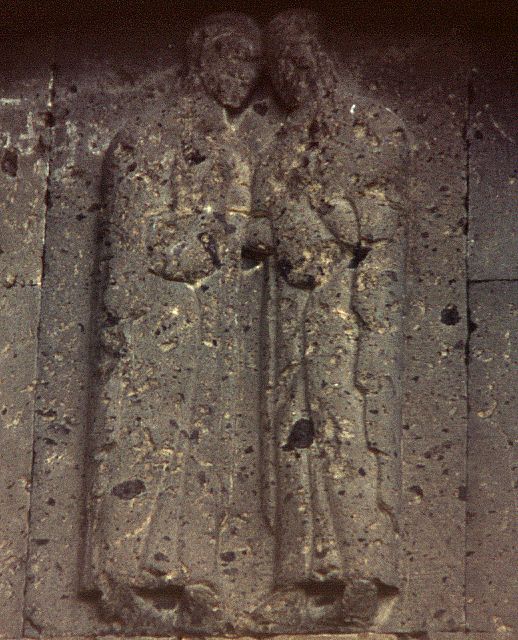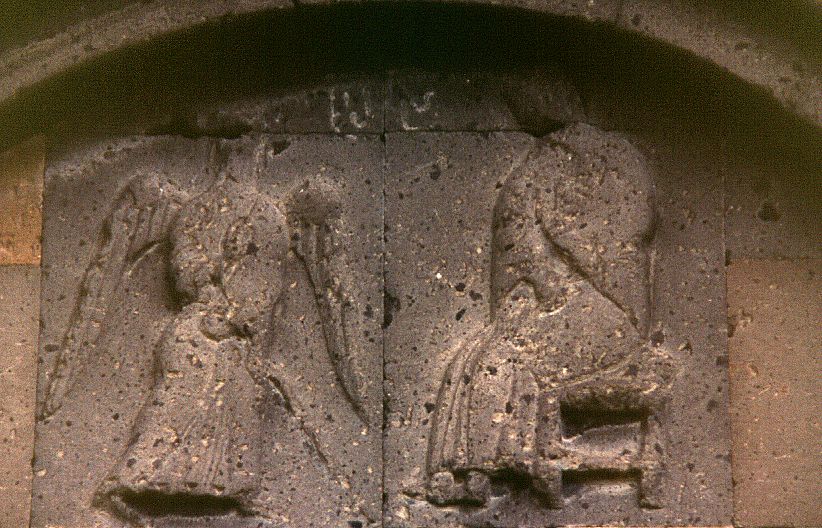 In the two arcades closest to the apse are groups of figurative sculpture carved in bas-relief. These depict two scenes from the Live of the Virgin: the Annunciation and the Visitation. The scenes are depicted in the conventional manner, except that none of the figures have halos.