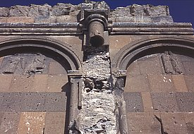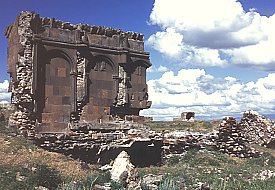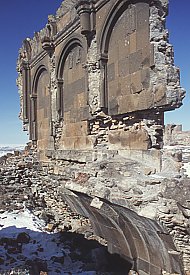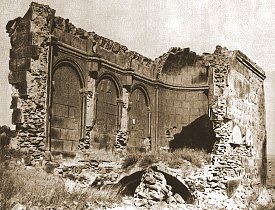 Gürcü YazıtlarıGüney duvarının bir bölümünde 1288 tarihli bir Gürcü yazıt varmış. Güney duvarının gerisinin dökülmüş parçaları 1910'da kazıldığında, bir Gürcüce yazıt daha bulunmuştur. Bu yazıt 44 (muhtemelen ilkin 50) adet kaplama taşının üzerine oyuluymuş ve 20 satır uzunluğundaymış. Parçaları alınmış, yeniden düzenlenmiş ve Ani Müzesi (Manuçehr Camii) dışında sergilenmiştir. Birinci Dünya Savaşı'ndan sonra yazıt yok olmuştur. 1998'de kayıp blokların beşi Ani Ocaklı köyünün ev duvarlarında bulunmuştur. Yazıt 1218 tarihliymiş ve Gürcistan Katolikosu Epifan'ın Ani'de yaşayan Gürcülere vaızını kaydetmiştir. En sonundaysa Ermenice, Ani Ermeni başpiskoposu Grigor ve Ani valisi Emir Vahram tarafından imzalanmıştır. Kilise vergilerinde indirimi ilan etmiştir, müminleri daha eli açık olmaya teşvik etmiştir ve Gürcü rahipleri dalalette bulunmama konusunda uyarmıştır. Bu dönemde "Gürcü" sıfatı sadece etnik kökeni Gürcü olan birini değil, aynı zamanda Ani'de mezhep olarak Kalkedon inancını ikrar eden herhangi bir kimseyi de kapsar. Gürcü Kilisesi'nin bu ibadethaneyi denetlemesine rağmen, cemaatinin çoğu Ermeni olmalıymış. Bu kiliseye tarih saptamaya yarayacak herhangi bir yazıt günümüze gelmemiştir. Gürcü yazıtları, Ani'nin Gürcü himayesi altında olduğu 13üncü yüzyıla işaret eder. Öte yandan, 11inci yüzyılın başlarında da inşa edilmiş olabilir. | ![]() |