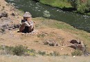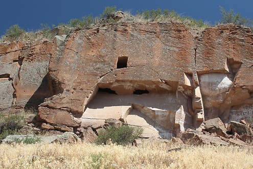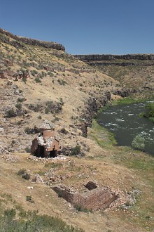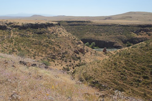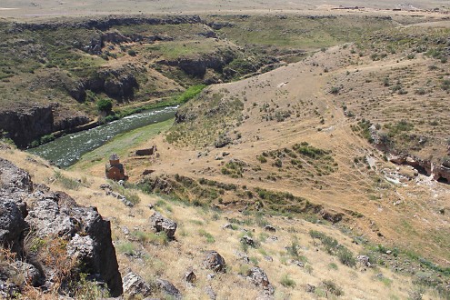 To walk to Karmirvank from the city walls of Ani takes just under an hour. Use the road that runs past the "Ani restaurant" (built on the site of the former army base at Ocakli village) and continues as a dirt track through cultivated fields. The easiest way into the small gorge containing the monastery is by using an old trail that zigzags its way down the slope that overlooks the site to the southwest - this is probably the original access route to the monastery. There is a second rougher trail a little higher up the same gorge on its north side - this probably provided access for those approaching the monastery from the north, from the direction of Horomos monastery. It is also possible to reach Karmirvank from Ani by walking along the top edge of the gorge above the river, starting from the abandoned watchtower oposite the Tigran Honents church. However, this route may attract unwanted attention from local guards at Ani or Russian border guards on the Armenian side of the border at Kharkov. It is not possible to get there by walking along the riverbank from below Ani (an earlier version of this page erroniously that it was).