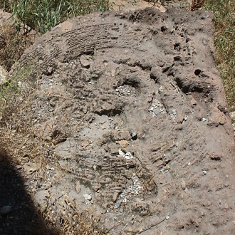 This inscription no longer survives, but a block of facing stone now lying below the south facade carries two lines of lettering from it (see photograph 19). In 2004 Baladian also noted this stone, as well as another block bearing an additional fragment, and translated the inscription as: