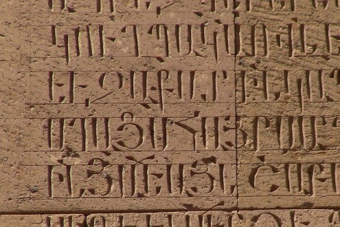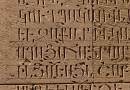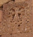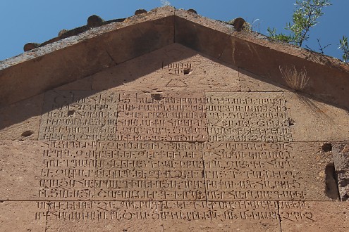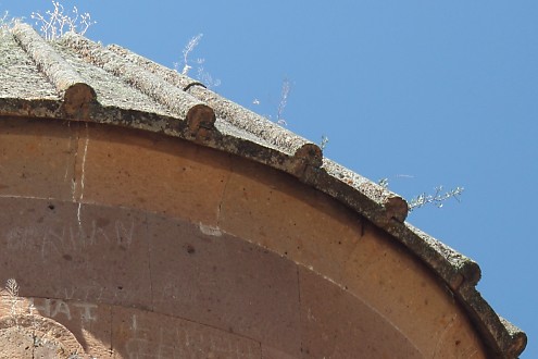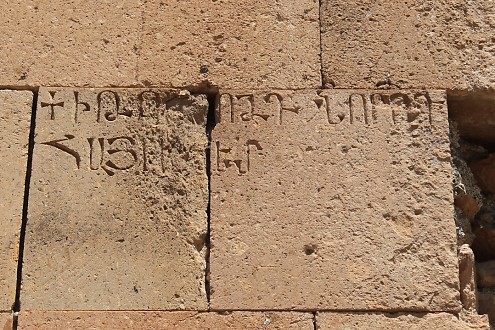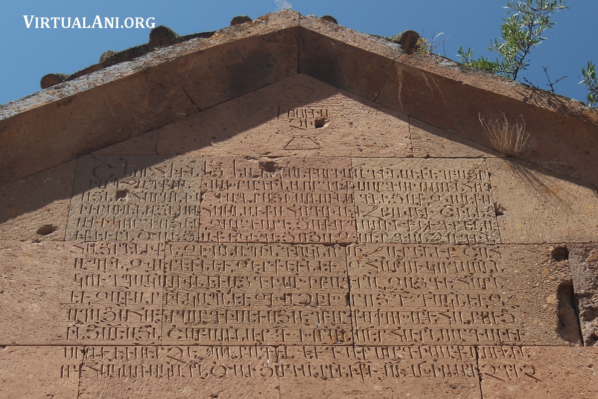 The most important inscription on the church is 14-lines long and carved under the gable of the east facade. It was recorded by Basmadjian in 1903 and, as his inscription 70, published and translated into French. Baladian's translation (also into French) has some improvements, mostly clarifying some confusing words [note 8]. The inscription is dated, with the date section separate and placed inside a circle: