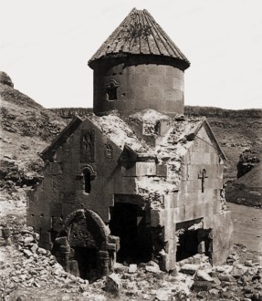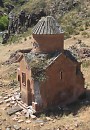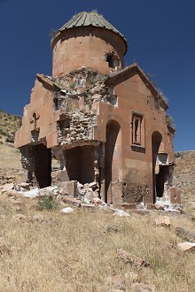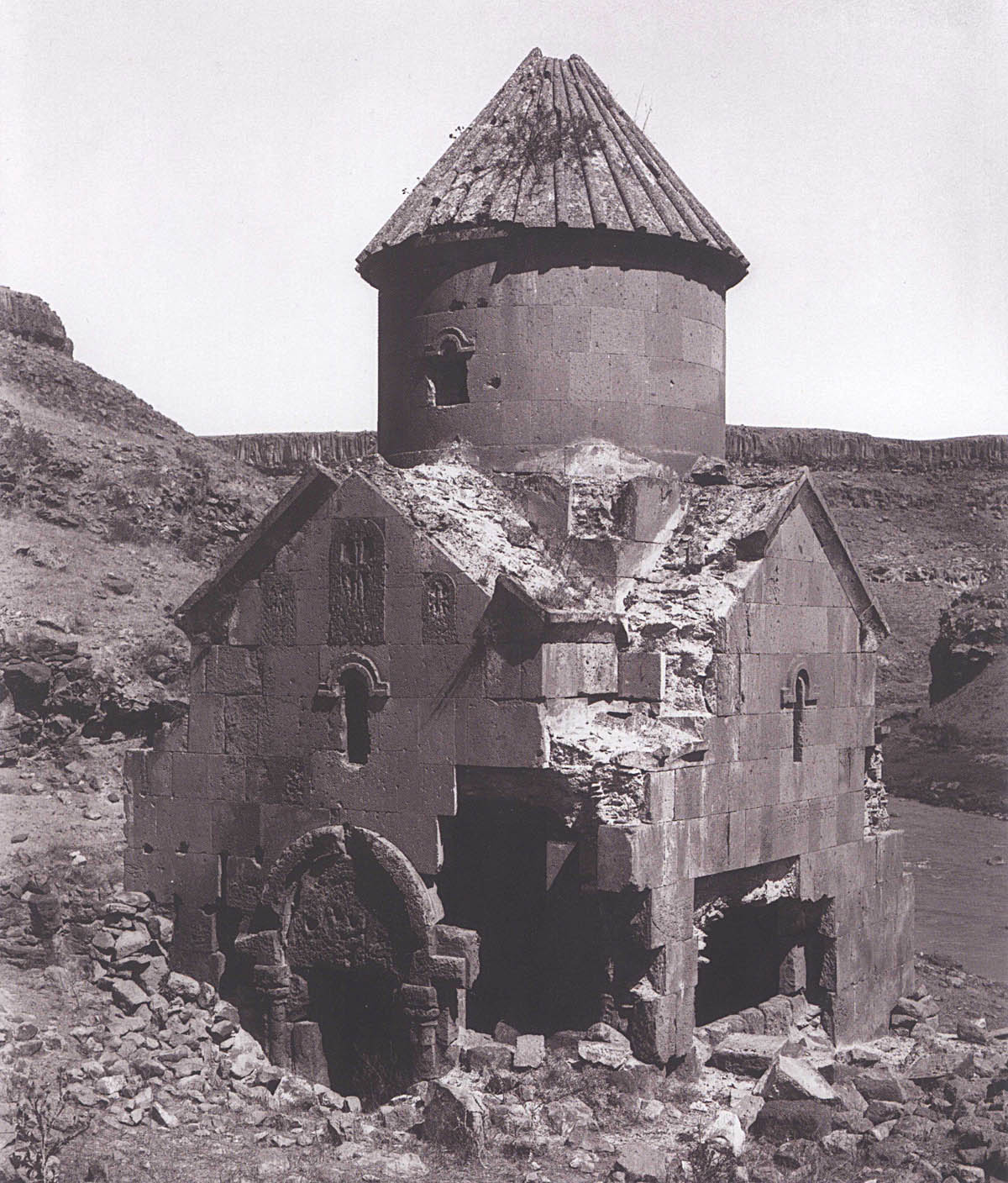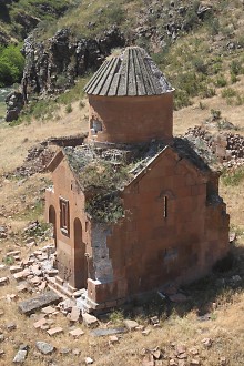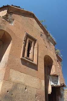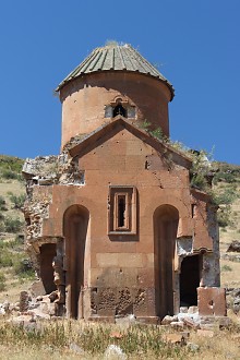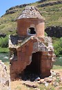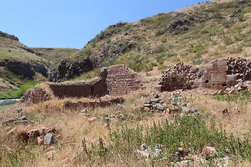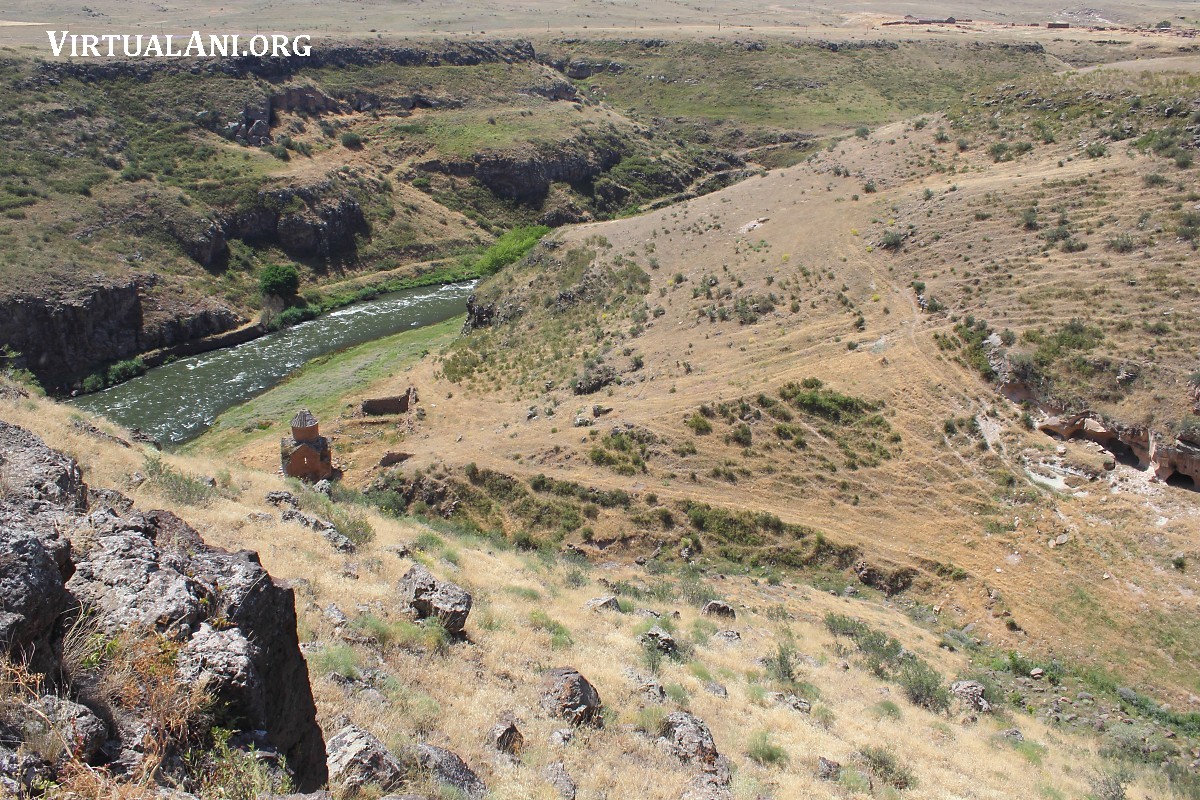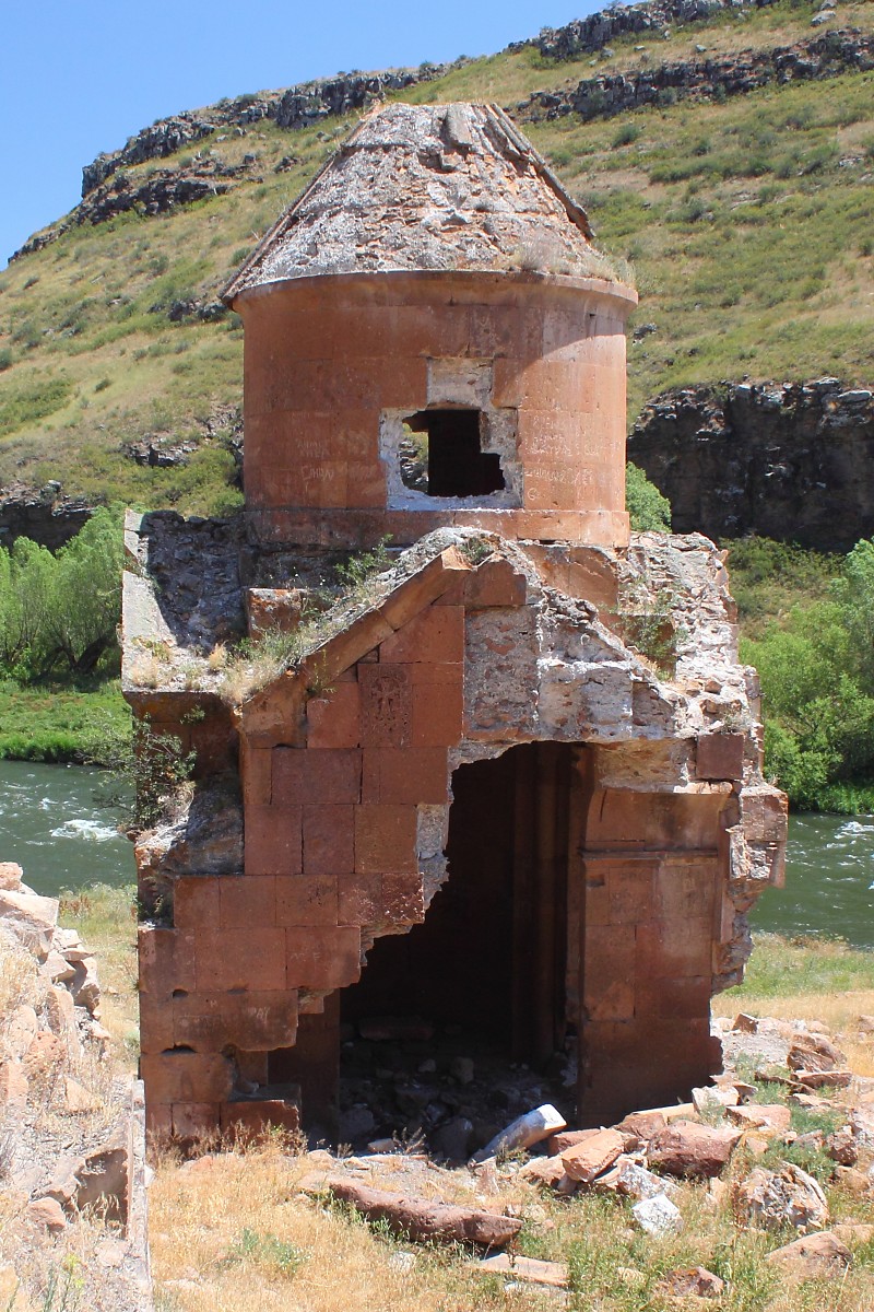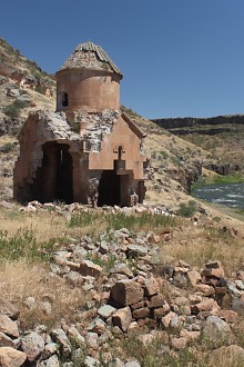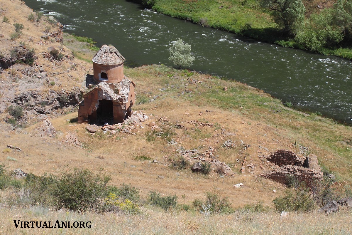 About 3.5 kilometres east-northeast of Ani, at the lower end of a small dry gorge, and some 40 metres from the bank of the Arpa / Akhurian River, is a small and partially-ruined church. The ruins of ancillary buildings suggest it was part of a small monastery, and this confirmed by an inscription on its east facade.