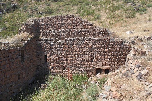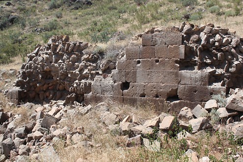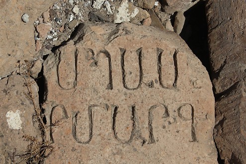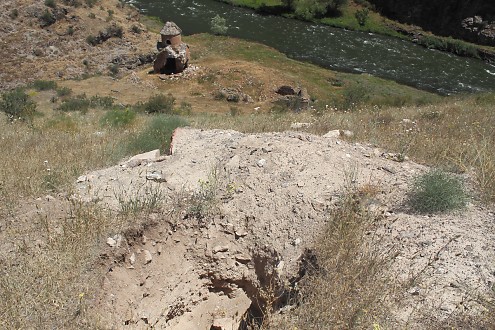 There is a cemetery site located half way up the slope that overlooks the monastery to the south, a little to the east of the zigzagging track from the plateau to the monastery. No khachkars or inscribed stones are visible in the cemetery, and a number of the graves have been recently dug up by treasure hunters.