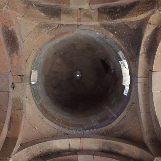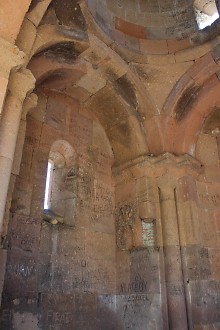 The interior surfaces are all bare, with smooth-finished and well-jointed stonework. There is no evidence of plastered surfaces. Decoration is minimal and consists almost entirely of architectural elements: at each corner of the bay under the dome is an engaged column topped by a plain cushion capital and there are impost mouldings at the springing line of the vaults. The only other sculptural element is a khachkar set into the wall high above the entrance to the northeast corner chapel. There is not a matching khachkar above the southeast corner chapel entrance. It is a reused khachkar: its left side has been cut down to fit the available space. It also shows traces of having being whitewashed. Its architectonic form - the cross is under a semicircular arched frame and the arch has a scroll of alternating leafs and rests on pilasters – is typical of khachkars dating from the end of the 10th century.