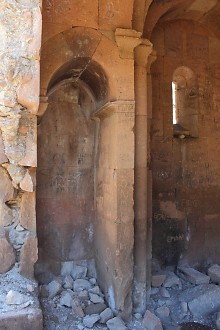 The apse is semicircular, has a niche in its north side, and has a raised bema that fills the entire semicircle. The outside edge of the bema floor is rough and untidy, indicating missing paving blocks and that the bema formerly extended out a little further (probably as far as a line drawn between the outer edge of the engaged columns, maybe as far as one drawn between the east walls of the north and south bays). Baladian may have misinterpreted the foundation of those missing paving blocks as belonging to the floor level of the central bay of the church because she writes "le béma présente une élévation d'à peine une marche par rapport au niveau de la sale" ("the bema has an elevation of only a step above the room level"). The original floor surface of the church is hidden under rubble, but its level can be estimated by looking at the lintels of the doorways to the corner chambers. Their undersides are 44cm above the level of the bema floor. If the minimum usable height of these doorways is perhaps 1.2 metres, then the bema must have been raised at least 76cm above the floor level of the rest of the church, or the height of three steps.
