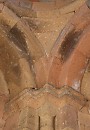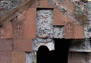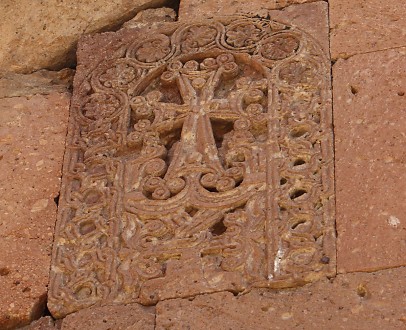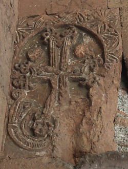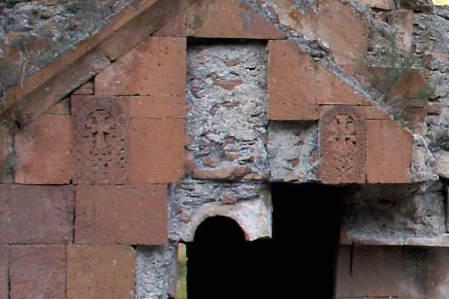 There was originally a window above the entrance, matching the surviving windows in the north, south and east facades. All trace of it has now vanished but the top half of it on the inside survived until at least 2013. There is a small khachkar on the left side of the gable of the west facade. The photograph of Karmirvank in the 2014 WMF report, which was taken in 2013, shows a similar but slightly smaller khachkar at the top right side of the same facade. This khachkar had vanished by 2015. A gap in the facing stones indicates that a large rectangular masonry block was once located vertically under the apex of the gable of the west facade. Visible in the Toramanian photograph, it was a third khachkar, considerably larger than the other two. The surviving khachkar has an arched frame with the arch section containing a scroll of grape vine-like leaves and the sides a fretwork interlace. The now missing slightly smaller khachkar had a very similar design, but with the decoration on the arched frame being a continuous fretwork of interlocking curves. The three khachkars do not appear to be reused gravestones but carved when the church was constructed.