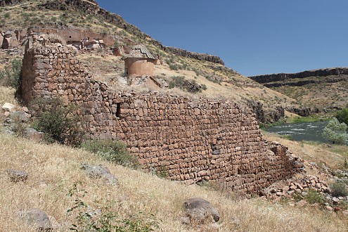 At each end the wall turns 90 degrees to continue in an easterly direction. On the north side this wall probably ended at the northwest corner of the church (a ruinous wall is shown in Toramanian's photograph). The end point on the south side is unclear. The southwest corner is curved on the exterior, and this feature, together with the height and solidity of the wall at that location, gives the visual impression of a defensive wall. However, there are no certain traces of a wall along the eastern side of the monastery, so it would be an unproven supposition to state that the monastery had an actual enclosure wall.