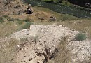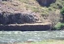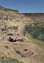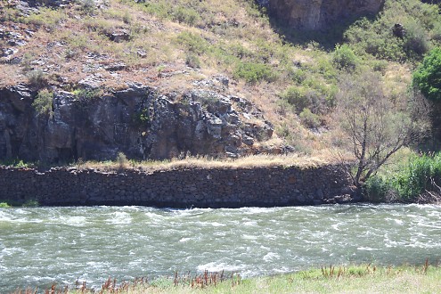 On the opposite side of the Akhurian, in Armenia, there is a stone embankment constructed of fieldstones that carries an old roadway over a section of the river bounded by a cliff (see photograph 32; the roadway it supports is visible in photograph 2). I am uncertain of the age of this structure; it might be medieval, being similar in appearance to the embankment supporting the roadway to the bridge at Ani. The track seems to end about 200 metres to the northeast, close to the river bank. This may mark the location of a ford across the river - though no immediate continuation of the track is visible on the other side, unless Karmirvank itself lies along its route. Its route in the opposite direction can be traced as far as Kharkov. Kharkov is a Soviet-era army base, still in use, but there are the ruins of an old village also on the site.