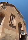 The rest of the exterior is rather plain. Except for the three khachkars and the portal ensemble, decorative elements are limited to just a simple rectangular beaded moulding around the apse window, plain hooded mouldings above all the remaining windows, and ribbing on the roof tiles. Despite that, the building's vertical proportions, the strong reddish-orange colour of the tufa stone used in its construction, and the beauty of the location, give the church an eye-catching appearance.