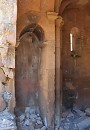The south and west facades have sustained serious structural damage – the entire lower half of the south facade is gone, as is most of the west facade with the exception of its north corner. The northeast corner of the church is also badly damaged, the roof has lost most of its stone roofing slabs, and selected facing stones have been carefully removed from various parts of the exterior.