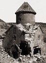 The west facade has the sole entrance to the church, though almost all trace of this entrance has gone. The photograph by Toramanian (see below) shows a rectangular opening under a large tympanum that is framed by a hooded archivolt moulding. The opening is flanked on each side by a pair of engaged columns with globular capitals – the top of the capitals meet the base of the archivolt. The tympanum, a large monolithic block of dark stone, is now lying face-up on the ground. There is carved decoration on it that has become too worn to be fully made out but consists of a large roundel with a wide circular frame of chain interlacing and a central motif that might be a cross.