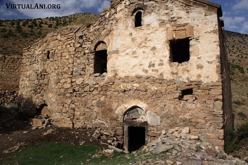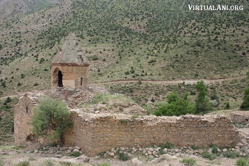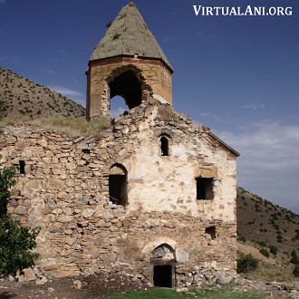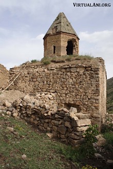 The monastic complex survives as two churches and a ruinous defensive wall. The main church, called Surp Astvadzadzin (church of the Holy Mother of God) [note 2], is a large structure with a dome above a tall drum. On its north side, and built against its north wall, is a smaller church whose name is unknown. Both churches are built of irregularly shaped blocks of schist stone. The defensive wall is still fairly intact on the eastern and northern sides of the monastery where it is 1.4 metres thick. On the southern side the wall has completely collapsed and the location of the entrance cannot be identified.