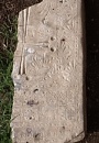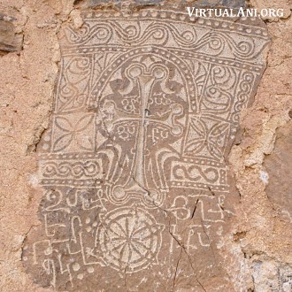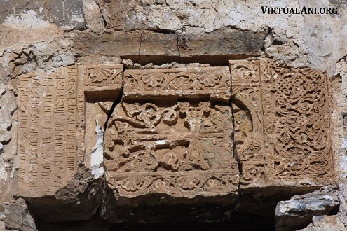 At the apex of the west gable is a partially-destroyed plaque with an inscription in Armenian that is too worn to decipher. On the same gable, on its cornice at the south west corner, is a short inscription dated 1878 that might refer to a repair of the roof. The church has no other surviving building inscriptions that help with its dating. One of the gallery doorways is formed from a reused khachkar. It has an inscription, stating that it was erected in 1306 by a Father Thaddeus as a memorial to Christ [note 3]. There are numerous other khachkars of simpler designs [note 4] reused throughout the walls of the church, both externally and internally. A number of them also have dates: Thierry mentions 1276, 1347, 1380, and 1411. This would suggest that the church was built sometime after the early 15th century. The quantity of reused khachkars indicates that there must have been a religious structure on the site before the present church. There are also a number of inscribed stones on the outside walls: many of these are probably votive inscriptions and are not reused material.