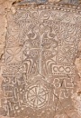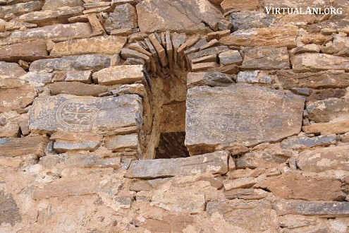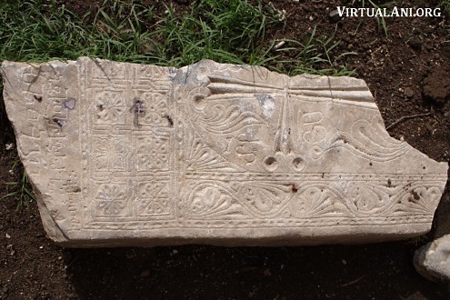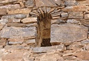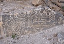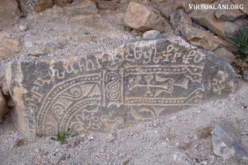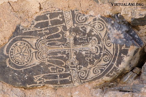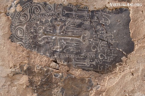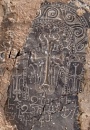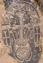4. The designs of these khachkars are unusual. They are carved on bluish, irregularly shaped slabs of schist. Their energetic designs are hammered or scratched into the flat natural surface of the stone. The arms of the crosses end in two disks, the flowering heads and feet of the crosses are rendered basically, and the crosses often rest on large rosettes. The crosses are almost always framed by arches carved with sinuous vine-scrolls or palmettes. The same type of designs is found on the few remaining stones in the monastery graveyard. Similar gravestones also survive on Aght'amar.