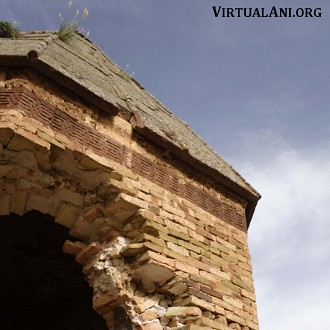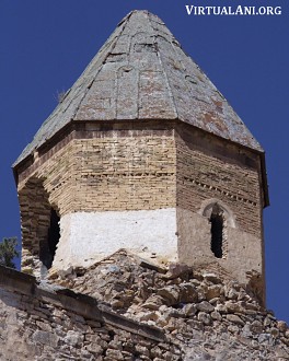 The drum of the church is cylindrical internally, octagonal externally, and supports a half-hemisphere dome. Both drum and dome are constructed of brick. The drum has four windows. Above the windows on the outside are hooded shapes that hark back to the hooded mouldings found above the windows of earlier medieval Armenian churches. But these are not true mouldings since they are inset into the drum. Above the level of the windows is a single course of brickwork laid for decorative effect, with the bricks set at angles. Thirteen courses above this is a single course of stonework: a band of red tufa carved with a six-strand interlace. The octagonal pyramid-roof of the dome has a very steep pitch, and is clad with stone slabs. The surface of the cladding is articulated by raised bands that run along the edges and down the middle of each face.