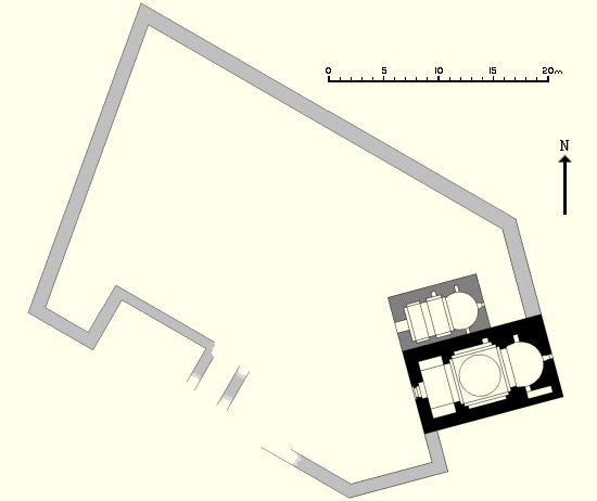 Except for the two churches, there are no surviving original structures within the wall's precincts. The cluster of single story buildings at the north-western end of the enclosure is modern and postdates the abandonment of the monastery (Thierry identifies them incorrectly as monastic cells). Used in the past as sheep folds and cow barns, they are now derelict and in a state of collapse.