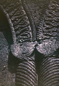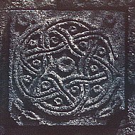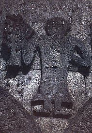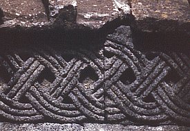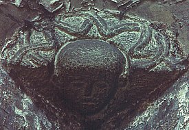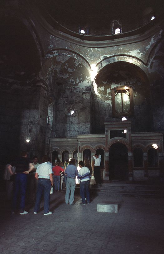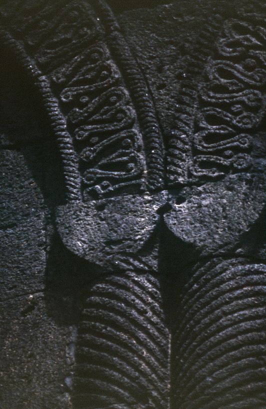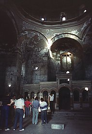 The figure above the western entrance is probably the most important - it is emphasised by birds carved on the capitals of the columns below it (all the other capitals are plain). This figure (number one in the above drawing) has a serpent at each side of his head, and probably represents Saint Gregory the Illuminator - the snakes referring to his years of confinement in a snake filled dungeon. The other figures may represent the Twelve Apostles (minus Judas, presumably). Most are depicted with their arms stretched upward (in a praying position?) or placed across their chests. One figure (number two) stands beside a tree, another (number five) appears to carry a hammer-like tool. The conical roof of the cupola rests on a cornice carved with an interlaced band of four strands. The cornice below the lower roofs has a band of intersecting lozenges linked like a chain. The windows of the drum are plain, but the lower windows have hooded mouldings. High on the walls of the church are many decorative rectangular plaques, the design of most being based on the cross. Another slab, lower in the wall, has a relief of a lion. Above a porthole window is a crudely carved human figure flanked by snakes - this is probably another depiction of Saint Gregory the Illuminator. Interior SculptureThe interior is very plain. The surface of the dome is divided into ribs. These is sculpture on the keystone of each squinch which may represent the traditional symbols of the four Evangelists. The north-west squinch has a carving of an ox (Saint Luke), the south-east one has a carving of an eagle (Saint John). The south-east and north-east squinches both have carvings of human heads - which is correct for Saint Matthew, but Saint Mark is normally indicated with a lion. In the spandrels between the arches of the squinches and apses is more small scale sculpture - mostly shell designs but including a human head.