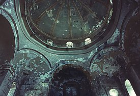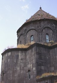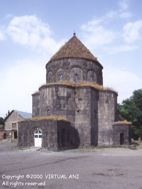 The Cathedral has no building inscriptions - very unusual for such an important structure built during the Bagratid period. Inscriptions probably did exist, but were removed by the later Muslim occupants of the building. All medieval authors refer to it simply as "the Cathedral". The name "Holy Apostles" is first recorded in the 19th century, and refers to the 12 figures carved on the drum of the dome. According to the tenth century Armenian historian Stephanos Asoghik, the Bagratid king Abas (who ruled from 929 to 953) "...built the holy Cathedral of the city of Kars ... with stone blocks polished with steel ... surmounted by a circular dome whose ornamentation resembled the vault of heaven". Stephanos continues, saying that this happened "...at that time Lord Anania was on the patriarchal throne". Anania was patriarch between the years 943 and 967. Construction of the Cathedral probably started shortly after Abas's coronation and was completed by the mid 940s. The common assertion that after the Seljuk Turks captured Kars in 1064, the Cathedral was abandoned for several hundred years is not credible given the prominence of the structure. There are also traces (staining on the stone walls) of what is probably a zhamatun built against the western facade - this is unlikely to date from before 1064 and is probably from the early 13th century. In 1579 the Ottoman Turks converted the church into a mosque. After the Russians captured Kars in 1877 the building was converted into a Russian Orthodox church. It was used mainly by the Russian military and was known as the "fortress cathedral". Small porticoes were added in front of the north, south and west entrances, and a sacristy constructed against the east wall. Inside the church an ornate stone iconostasis was built across the apse, and the walls were painted and given decoration and Cyrillic inscriptions in gold paint. A little later (the mid 1890s?) an elaborate belltower was constructed just to the north of the Cathedral. Strangely - considering it was built to serve what was now a Russian Orthodox church - it was a copy of the 13th century belltower at the Armenian monastery of Haghbat. After the fall of the Kars to the Turks in 1918, the Cathedral was turned back into a mosque. In 1919, following the retreat of the Turks, it returned briefly to its original function as an Armenian church, only to be turned into a mosque again in 1920 when the Turks recaptured Kars. Like most Armenian property in Kars, the church was confiscated and became the property of the Turkish state. They sold it to the Kars municipality, who had planned to demolish it and build a school on the site. This plan was fortunately never carried out, although the Russian belltower was destroyed. In the 1950s it was used as a depot for petroleum. During the 1960s and 1970s it housed a small museum. After this museum was transferred to a purpose built building, the church lay abandoned and increasingly derelict. In 1999 work began to convert it into a mosque. Design Analysis