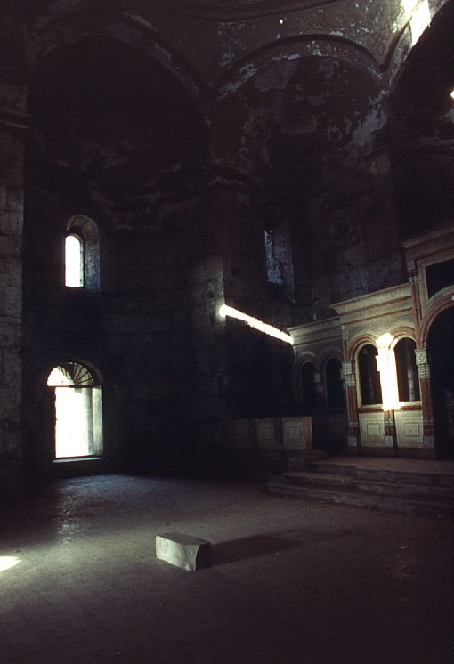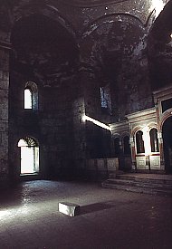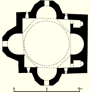 Small rooms, probably chapels, flank the altar apse. When the Russians constructed a sacristy against the east facade, a linking passage was cut through the eastern end of each of these rooms. Because of this it is not known if their eastern walls were flat or concave - they are drawn as concave on the plan above (which does not show the later Russian additions).