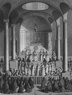 There are now rows of benches for worshipers to sit upon, but this is a recent innovation - in the past they would have either stood or kneeled upon a floor covered with carpets. The engraving below, from the 18th century and titled "Worship according to the Armenian Church", depicts this sort of arrangement.