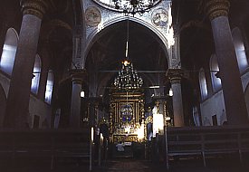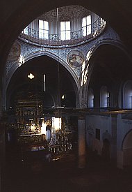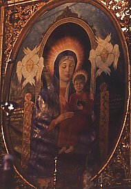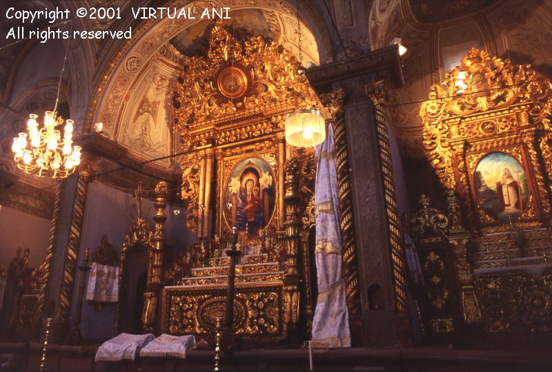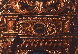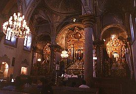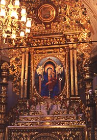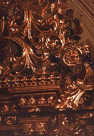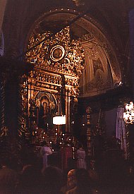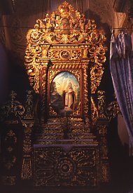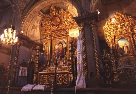 The nave and two aisles each end in an apse containing an altar. These highly ornate altars glisten with wood and plaster gilded in gold. Each contains a painting - these are recent works (dating from the year 1999?) that replaced the 19th century originals.
