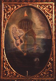 The painting within the north altar is the most interesting. It depicts the vision of Saint Gregory: four columns of fire, with capitals of cloud, each surmounted by a flaming cross, carried arches that supported a dome of clouds, topped by a throne and the cross of Christ shimmering in divine light. In the painting, the artist makes an explicit connection between this vision and the traditional domed form of Armenian churches.