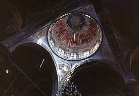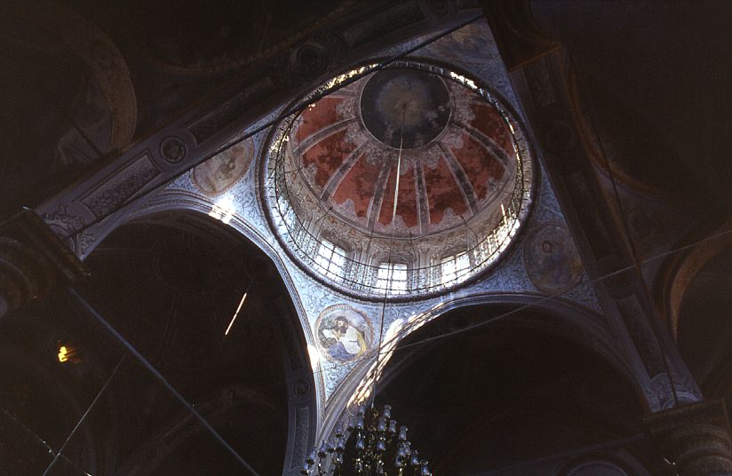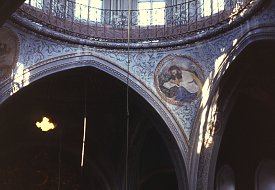 With the exception of the columns, the interior is entirely covered in plaster decorated with a mixture of motifs - European, Turkish, and Armenian - of little real artistic merit but very much of their time period. On the pendentives of the dome are depicted the four Evangelists: Matthew, Mark, Luke, and John, together with their attributes.
