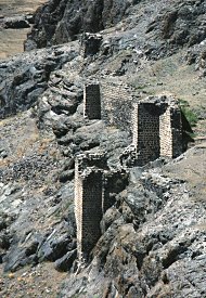 The most powerful defences are at the western end of the site, where a wall runs between the two valleys, the Buyuk Dere to the north and the Çiçekli Dere to the south. This wall is high and has five u-shaped towers. The overall effect has a visual similarity to the walls of Ani. Differences, however, include the absence of any crenellations and the lower quality of the masonry. The masonry used at Gechivan is roughly hacked blocks of stone and is very consistent in appearance, indicating that most of the walls were probably built during a single period of construction. None of the fortifications have surviving inscriptions or decorative features.