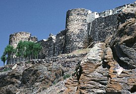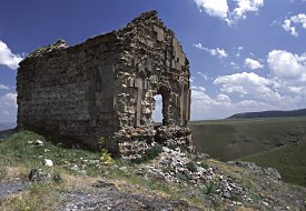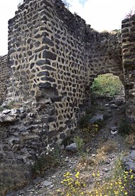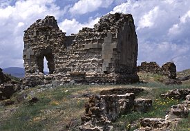 At the eastern end of the site is isolated from the rest by a break in the plateau. This section of the medieval city appears to have been independently fortified. Located within the fortifications are the ruins of a church and the foundations of several unidentified structures.