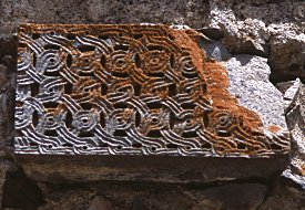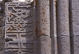 Although the surviving fragments of in-situ sculpture on the west façade are now limited to only a few blocks of stone, enough remains to reveal that it was once richly decorated. The entrance was framed by a rectangular panel composed of several friezes and bands of mouldings - flanking the doorway was a frieze in a pseudo-Kufic style, above it was a frieze containing a complicated interlace pattern. On each side of the rectangular panel was a shallow niche with a flat inner face and a shell-shaped top.