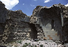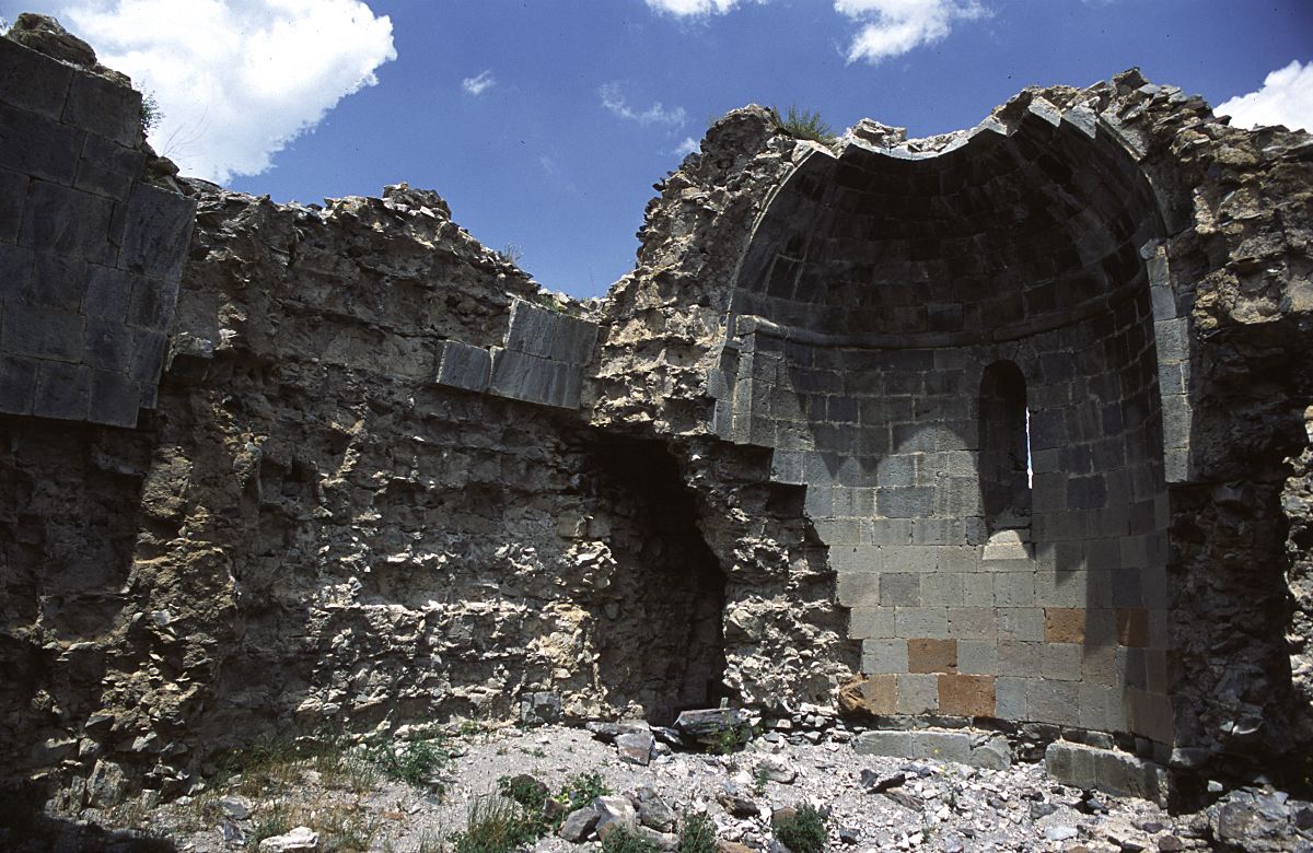 At a short distance to the south of the church are the walls of a rectangular building. This has been a well-built structure with a concrete core. There are clay pipes built into that core, perhaps indicating that it was a bathhouse. Clay pipes are also visible within some wall fragments at the eastern end of the main part of the plateau: they seem to have been part of a system of water distribution leading to the citadel. There are the foundations of more buildings to the north of the church. All these structures, and the church, may have been part of a monastery.